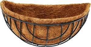Wall mount, half circle steel basket with a natural coconut fiber liner. Dimension of 14 in W x 6-1/2 in H x 6-1/2 in Dia.